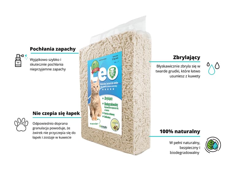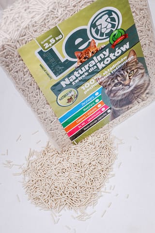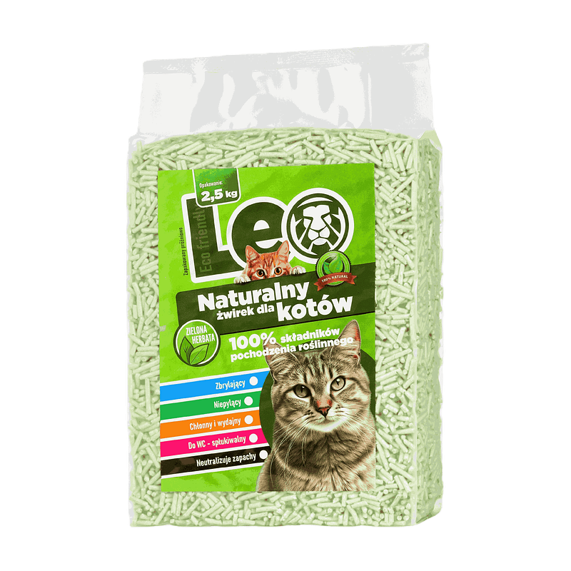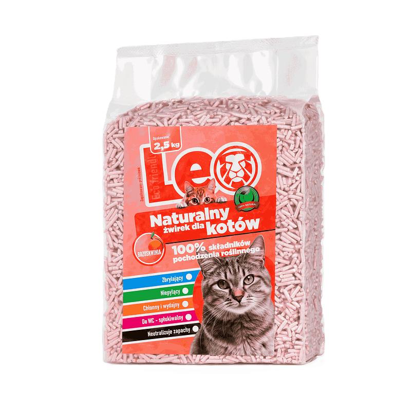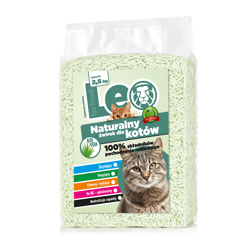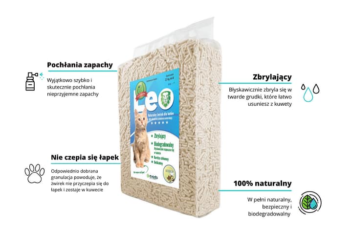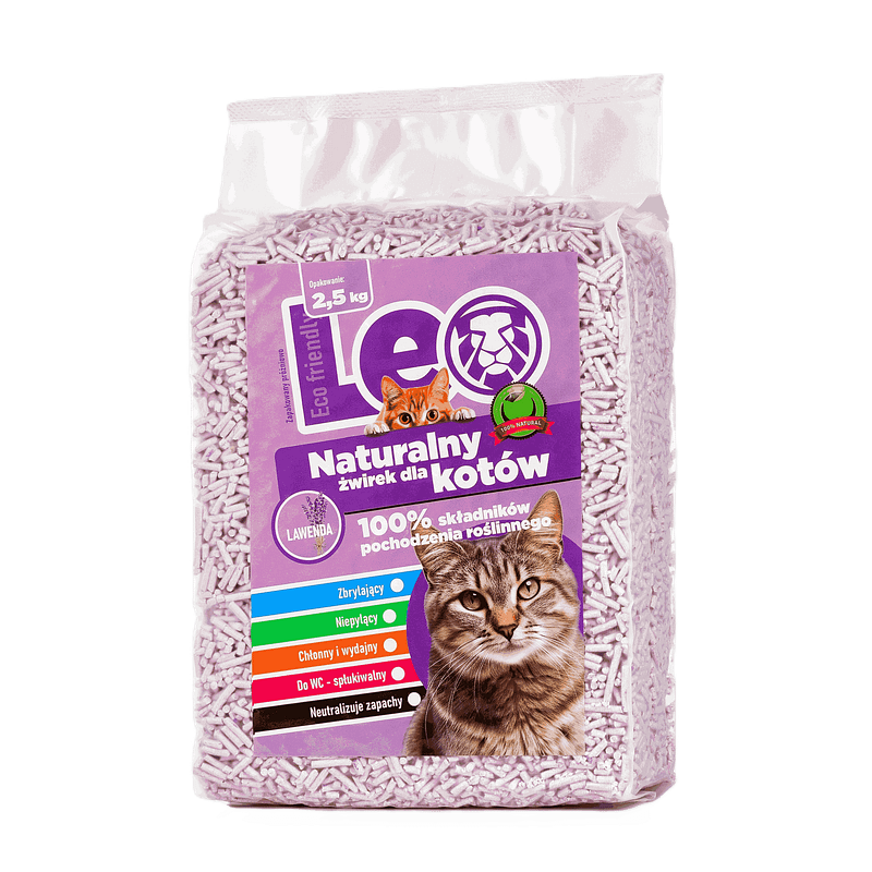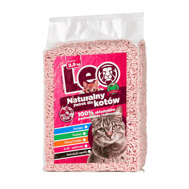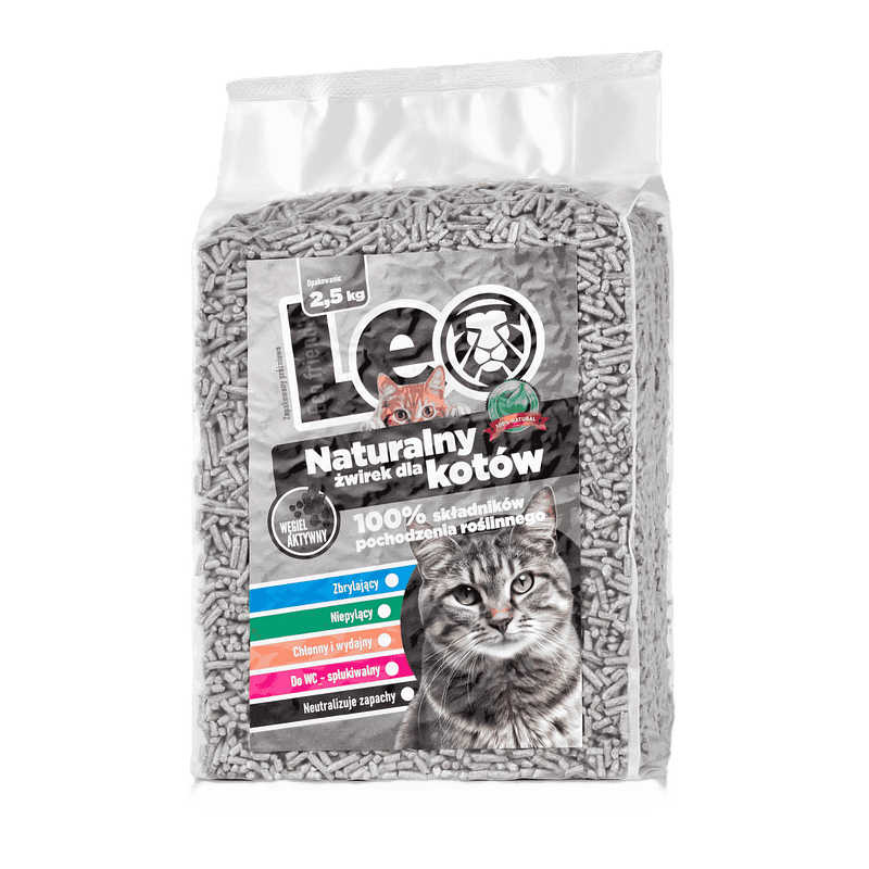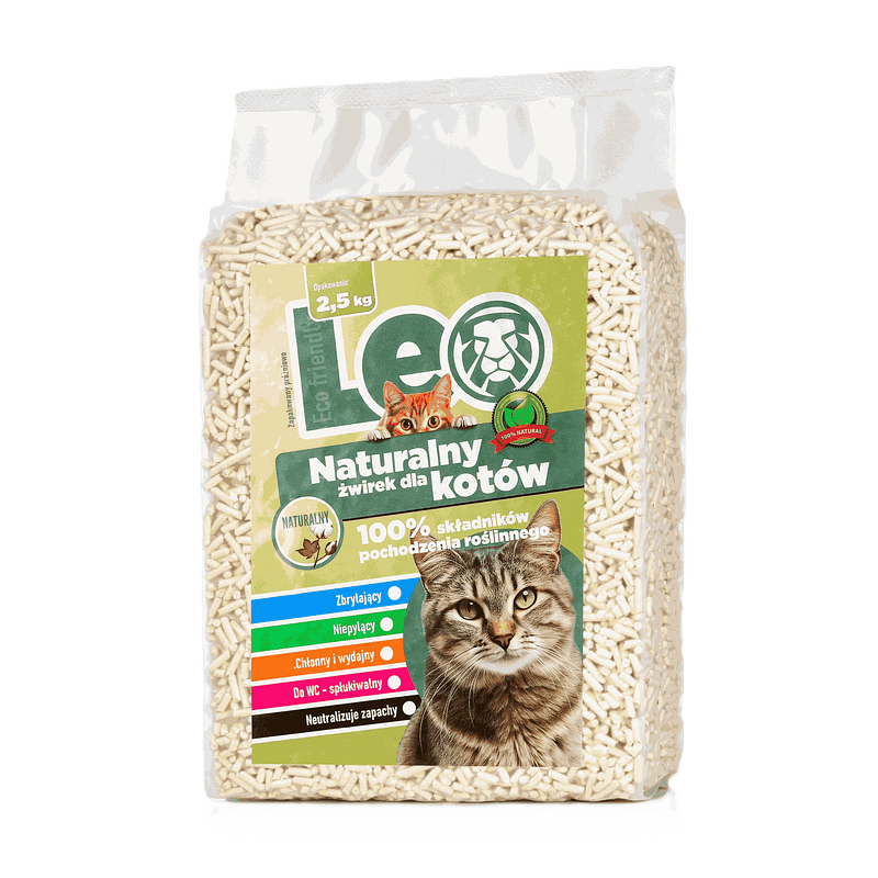 Żwirek dla kotów Leo pozbawiony jest dodatków chemicznych i fosforanów. Wolny od gliny, perfum i barwników.
