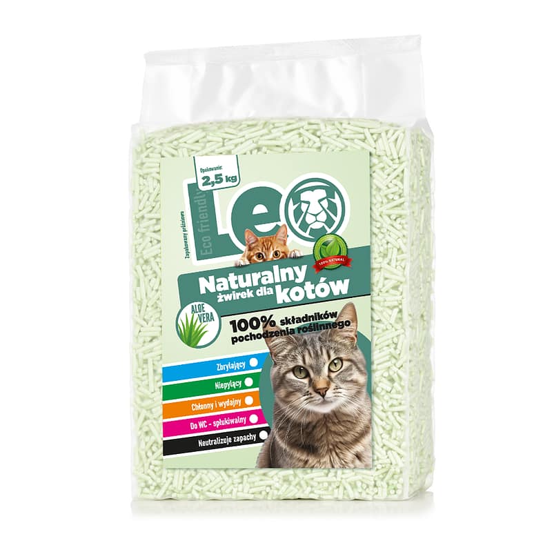 👉 Żwirek Leo Tofu Aloesowy 2,5 kg to naturalny, bezpyłowy i biodegradowalny żwirek dla kota, który łączy wysoką chłonność, neutralizację zapachów i wygodę użytkowania.